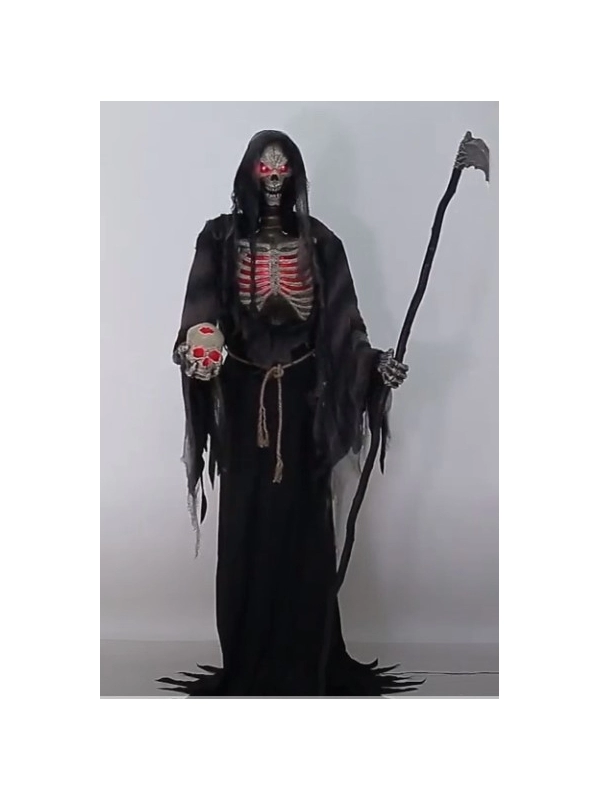 La faucheuse porte une faux à une main et dans l’autre un crane humain. Son torse, ses yeux et le crane s’éclairent d’une lumière rouge feu ; elle bouge de droite à gauche, son visage ainsi que sa mâchoire s’articulent lorsqu’elle parle. C’est exceptionnel comme qualité, cette faucheuse est magnifique.