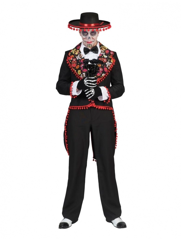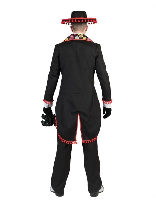 Incarnez le thème jour des morts avec style et classe grâce à notre déguisement d’élégance mexicaine. La veste queue de pie noire avec son col aux motifs de squelettes fluo et son galon pompons sur les bords, ainsi que la chemise blanche attachée, composent ce déguisement de grande qualité, disponible en tailles S, M, L et XL pour s’adapter à toutes les morphologies.