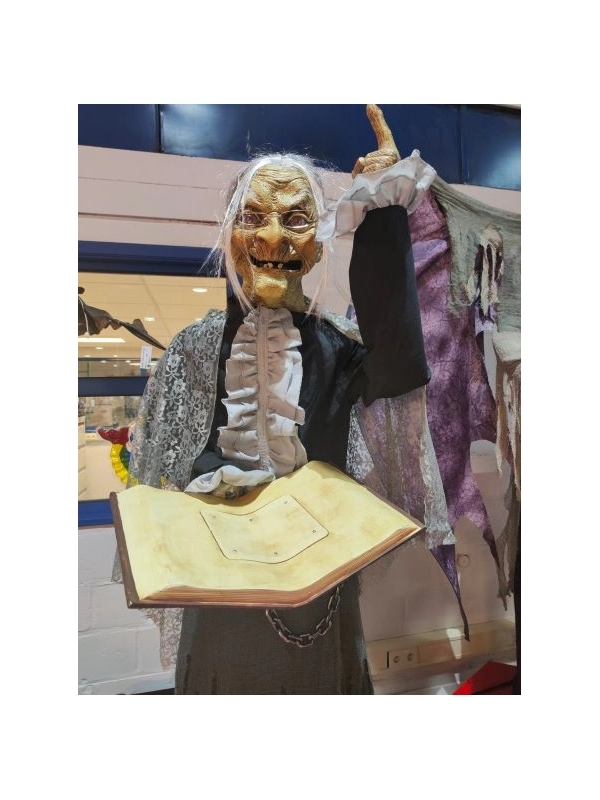 Automate sorcière animée, mouvement, son et lumière avec grimoire !