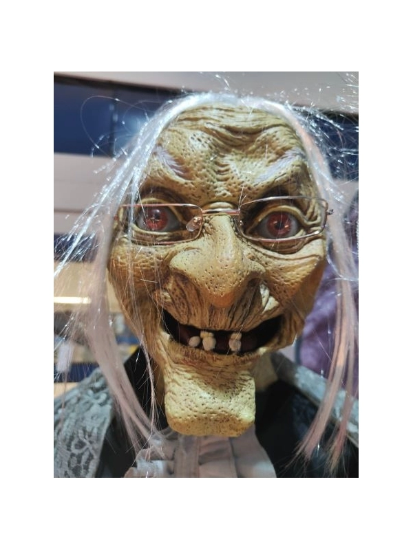 Les traits de son visage sont vraiment bien faits : son nez, son menton, sa peau avec des pores apparents, sa dentition et ses rides. Tout est là pour caractériser le physique d’une sorcière. Sa chevelure grise avec des mèches blanches est fournie et ses yeux rouges sont dissimulés derrière une paire de lunettes rectangulaire.