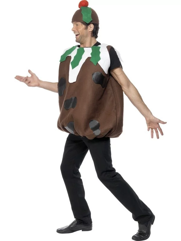 Le Déguisement pudding est de couleur marron et blanche. Il comprend un justaucorps noir (fausses feuilles vertes, aspect boule et glaçage blanc) et un chapeau marron (feuilles de houx et pompom rouge).