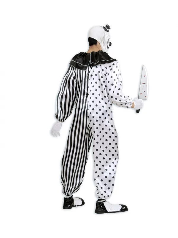 Le déguisement consiste en une combinaison d’un noir angoissant, agrémenté du col de clown et des boutons rouges macabres, signe apparent d’une vraie sanguinaire ! Heureusement qu’on parle du vêtement que vous porterez lors d’un simple événement costumé, où il n’est rien des scènes sanguinolentes des fameux films de clowns assassins sadiques. Quoique… avec le bon maquillage et le chapeau clownesque, et si vous partez avec un faux couteau, vous allez assurément plonger tout le monde dans l’effroi total.