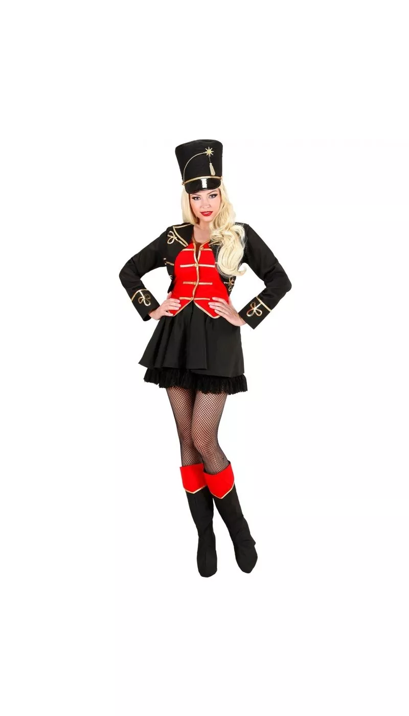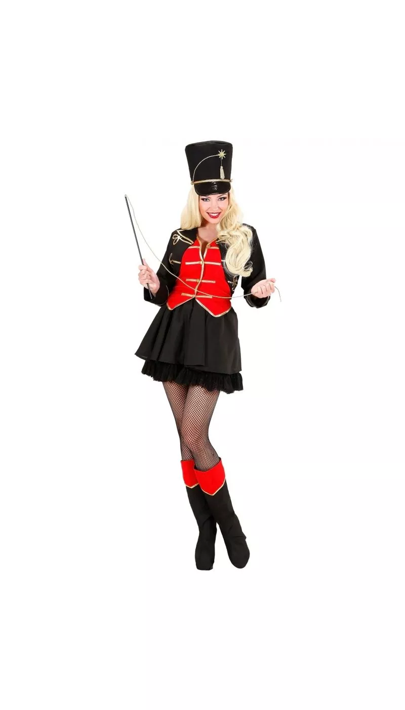 Déguisement femme dompteuse de cirque rouge et noir (veste avec gilet, jupe, sur-bottes, chapeau, fouet)