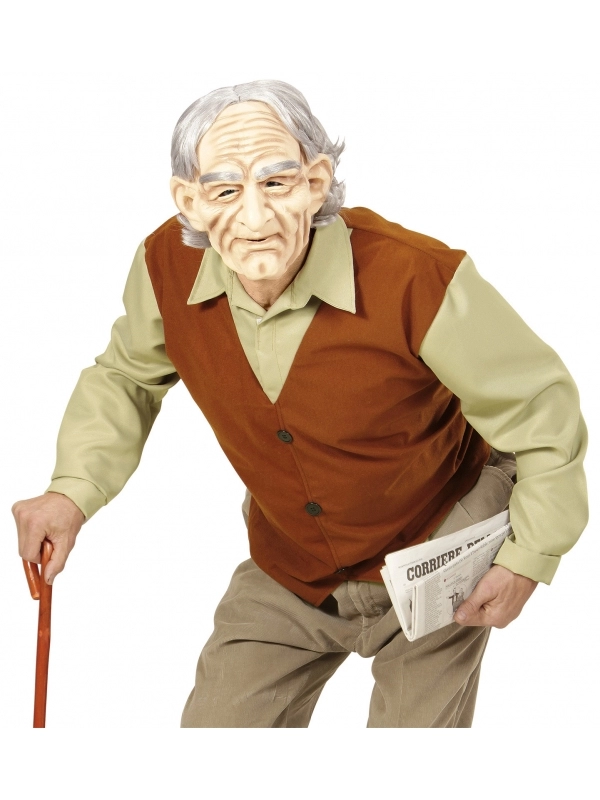 De plus ce déguisement comprend un masque ridé avec des cheveux et des sourcils gris.