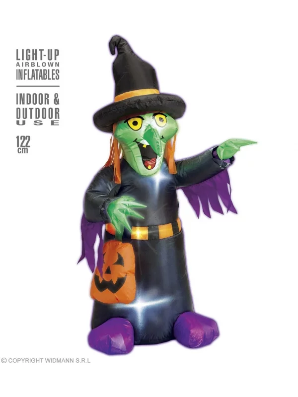 Cette sorcière gonflable est une décoration d’Halloween originale et amusante. Elle représente une sorcière verte avec un chapeau pointu, une robe noire et un balai. Elle mesure 122 cm de hauteur et s’illumine grâce à des leds intégrées.